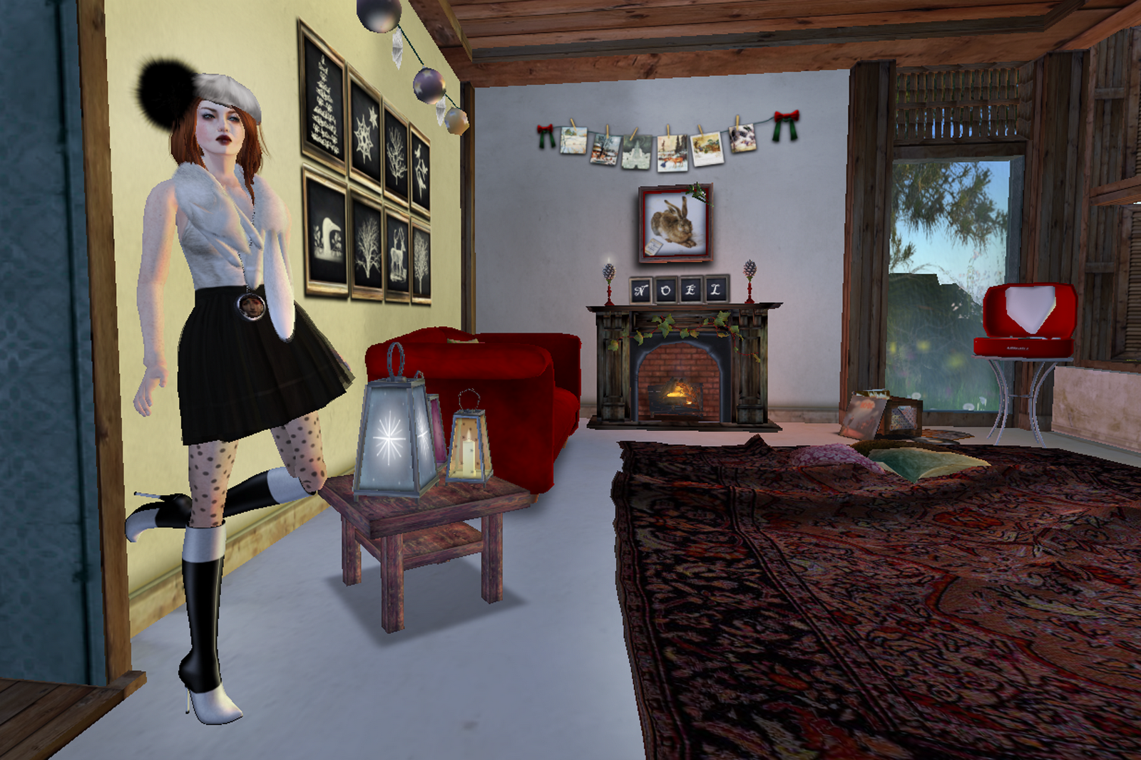 Couch, Giant Ornaments, Tree, Gifts, Cards, Mistletoe, Chalkboard Paintings, Fireplace Set, Card Garland, Twinkle Lights ALL from - LISP